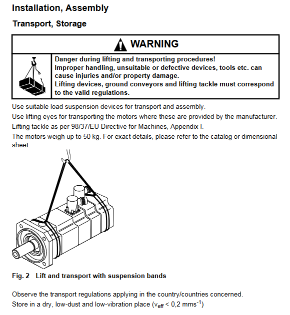 The maximum weight of the motor is 50kg, and lifting devices that comply with Appendix I of the 98/37/EEC Machinery Directive (such as lifting rings and slings) must be used for handling. It is prohibited for a single person to handle in violation of regulations.
