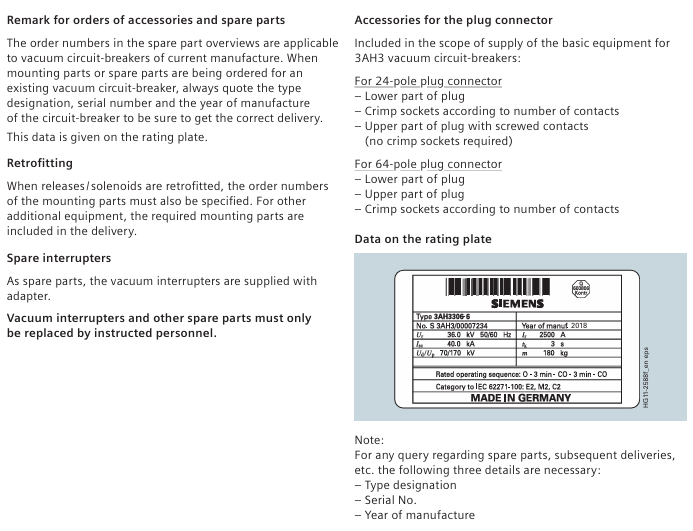 Basic positioning: Siemens 3AH3 vacuum circuit breaker belongs to medium voltage equipment, with document version 2018 (HG 11.03), replacing the old version 2010. The product production and sales follow ISO 9001, ISO 14001, BS OHSAS 18001 certification management system.