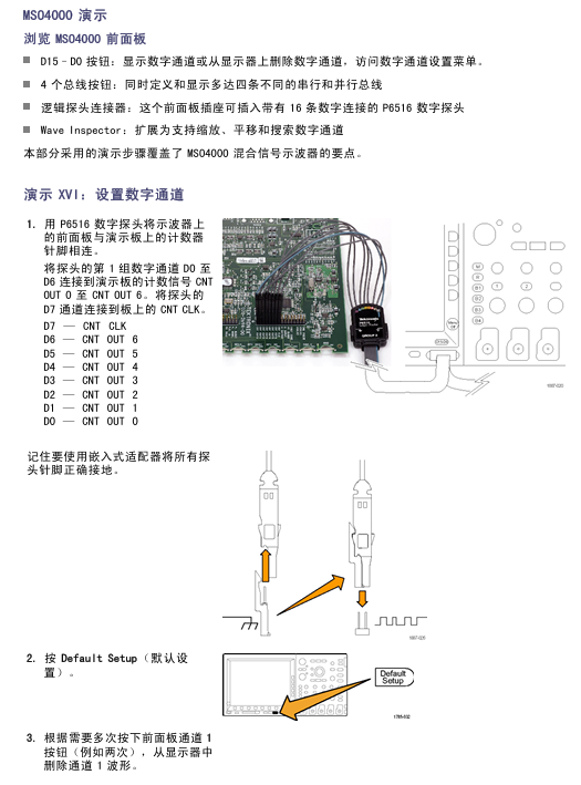 Step: ① P6516 probe (D0-D6 → CNT OUT 0-6, D7 → CNT CLK, all grounded); ② Default Setup "→ Close channel 1; ③ Set the horizontal "scale" to 200 ns/grid; ④ Press the blue "D15-D0" button (display digital channel, green=high, blue=low); ⑤ Set "height" to "M" (medium); ⑥ Open D7-D0 "(or separately open D0-D7); ⑦ Select D7 from "Trigger Menu" → "Source" → "Menu Off"; ⑧ Channel grouping: Highlight the group marker (inverted triangle), rotate knob b to move the group waveform.