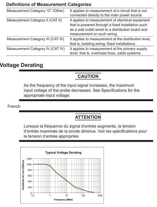 Voltage derating: When the input signal frequency increases, the maximum input voltage of the probe will decrease. It is necessary to refer to the "Voltage derating curve" to select the appropriate input voltage to avoid overvoltage damage to the probe; Pulse measurement must comply with the corresponding limitations of peak pulse voltage, duty cycle, and duration to ensure safe use.