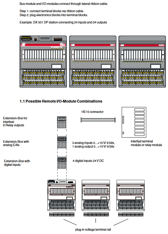 The ABB S500 series distributed automation I/O hardware technical manual focuses on the remote I/O module system of the PROFIBUS-DP protocol, covering three core hardware types: bus module, expansion module, and expansion box. It specifies the model parameters, installation specifications, wiring methods, parameter configuration, and fault diagnosis of each module, supports a maximum transmission rate of 12 Mbit/s, adapts to storage environments of -25 ℃~+75 ℃ and working environments of 0 ℃~+55 ℃, and sets the station address (1-125) through DIP switches to flexibly combine digital/analog input and output functions, providing a stable and reliable hardware solution for industrial automation distributed control.