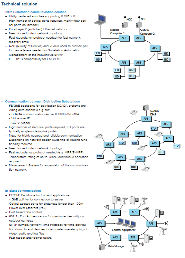Substation automation low latency, high availability, IEC61850 compatibility, anti electromagnetic interference pure L2 switching network, redundant topology, multi-mode optical ports as the main, QoS/VLAN enabled, SNMP management supported, GOOSE message and sampling value transmission supported