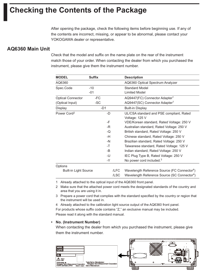 Host AQ6360 Host -1 Confirm that the back nameplate model is consistent with the order, and record the instrument number (to be provided when contacting the dealer)