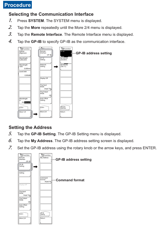 Press the SYSTEM button on the device to enter the "More 2/4" menu, select "Remote Interface" → "GP-IB";