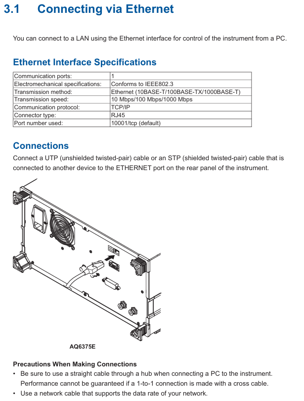 AQ6375E supports two remote interfaces, GP-IB and Ethernet, which cannot be used simultaneously. When one interface is enabled, the other will be automatically disabled.