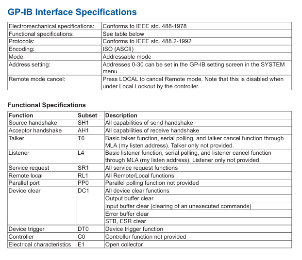 Electrical specifications: comply with IEEE 488-1978 (electromechanical) and IEEE 488.2-1992 (protocol), address range 0-30, encoded as ASCII;