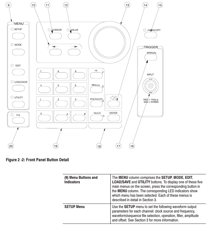 Trigger control area TRIGGER INPUT: external trigger input (maximum ± 10 V ₚ₋ₚ); MANUAL key: Manually triggered. In Triggered mode, press the MANUAL key to trigger waveform output once