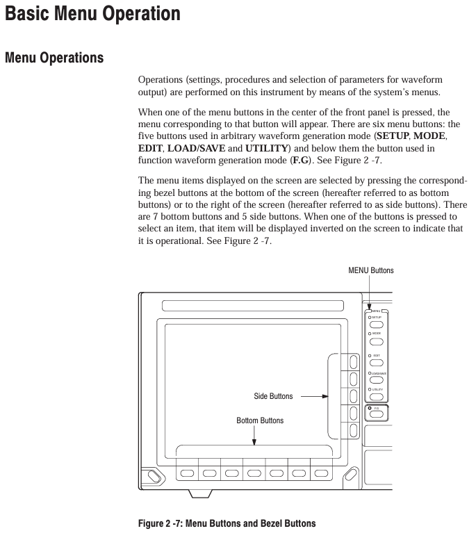 Triggered mode outputs a waveform every time it is triggered. External trigger (rising/falling edge) or MANUAL key is used