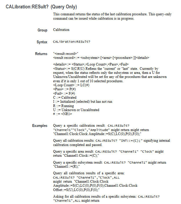 CALibration:LOG? Query calibration log with timestamp and result (PASS/FAIL), maximum 64K characters