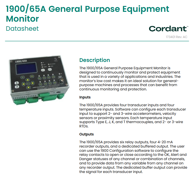 1900/65A is a universal device monitoring instrument under Baker Hughes' Cordant series. Its core value is to achieve low-cost continuous monitoring and protection of devices in multiple industries and application scenarios. Configuration information is permanently stored in non-volatile memory and supports independent operation or integration with DCS/SCADA/PLC systems. The document version is 173401 Rev. AC.