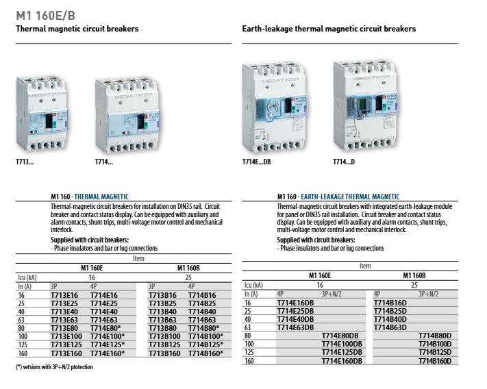 Hot magnetic M1 160 16-160A 16/25kA overload (thermal trip), short circuit (magnetic trip) DIN35 rail installation, supporting leakage module