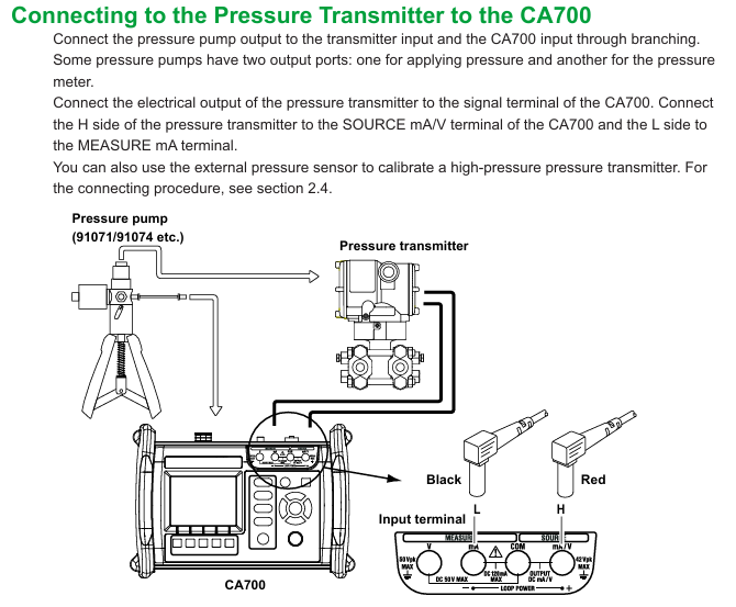 Hardware connection: The output of the pressure pump needs to be connected to both the pressure transmitter input and the CA700 pressure input port through a branch pipeline. Some pressure pumps come with dual output ports (for pressurization and pressure measurement respectively); The electrical output terminal of the pressure transmitter needs to be connected to the CA700 signal terminal, the H terminal of the transmitter should be connected to the "Source mA/V" terminal of CA700, and the L terminal should be connected to the "Measure mA" terminal; High pressure transmitter calibration can use external pressure sensors, which need to be connected to the external pressure sensor input terminal of the device with a dedicated cable when CA700 is powered off. After the device is turned on, the corresponding icon will be displayed when the sensor is successfully recognized.