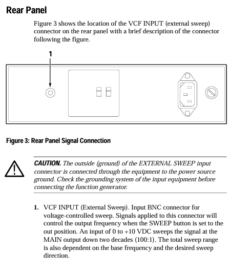 Interface limitation: The VCF INPUT input voltage of the rear panel can reach a maximum of ± 10 V ₚₖ. Exceeding this range may damage the internal circuit.