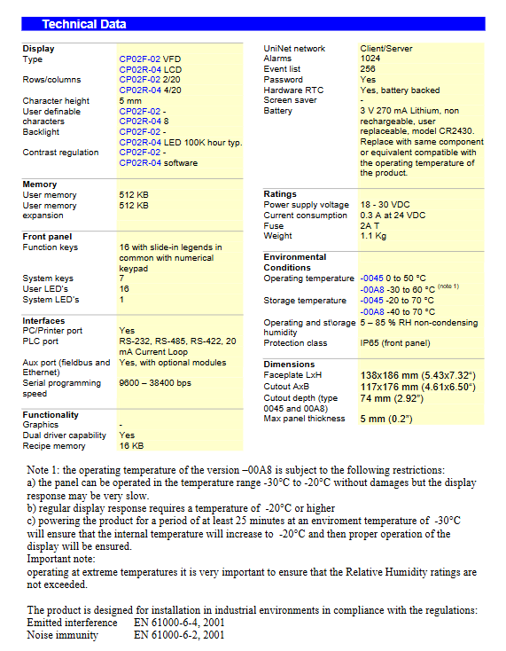 |Model suffix | Operating temperature | Storage temperature | Special restrictions (wide temperature version)|