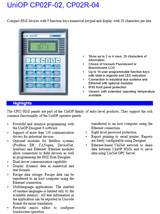 Core design highlights: 16 user programmable function keys (with slide in legend), 16 user LED indicator lights, front panel protection level up to IP65, supporting optional industrial bus/Ethernet modules, providing two versions of standard working temperature and extended working temperature.