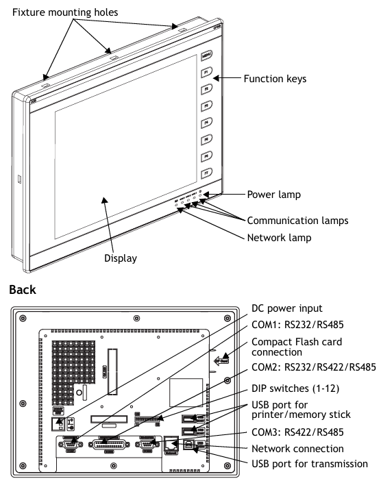 Rear panel: 24V DC power input interface, 3 communication ports (COM1~COM3), Ethernet interface, 2 USB host ports (for printer/USB flash drive), 1 USB device port (for data transmission), CF card interface, 12 bit DIP switch (for configuring working mode and communication parameters).