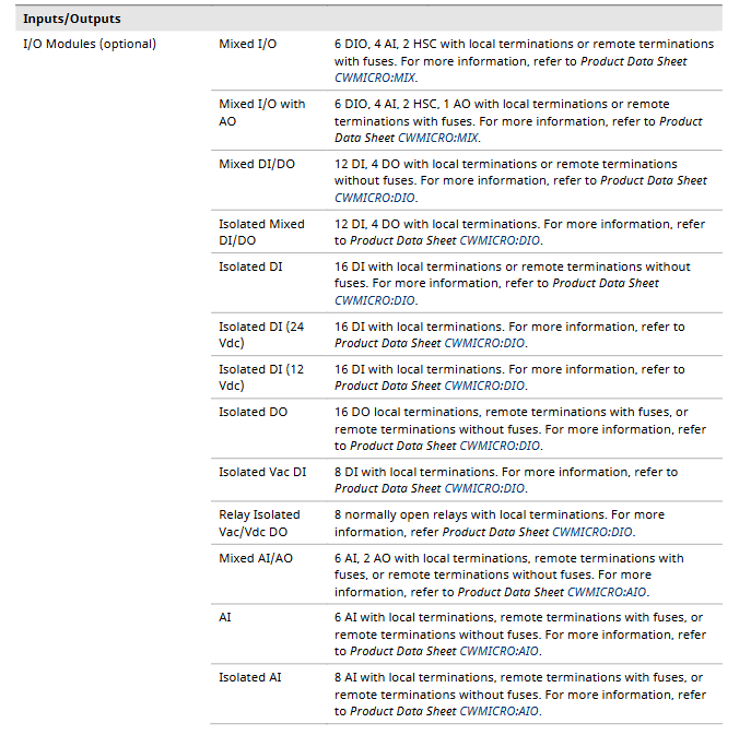 DI/DO 12 DI+4 DO, 16 DI, 16 DO, 8 DI (120-240 Vac) local/remote terminal (optional fuse) isolation type optional, maximum 6A relay output
