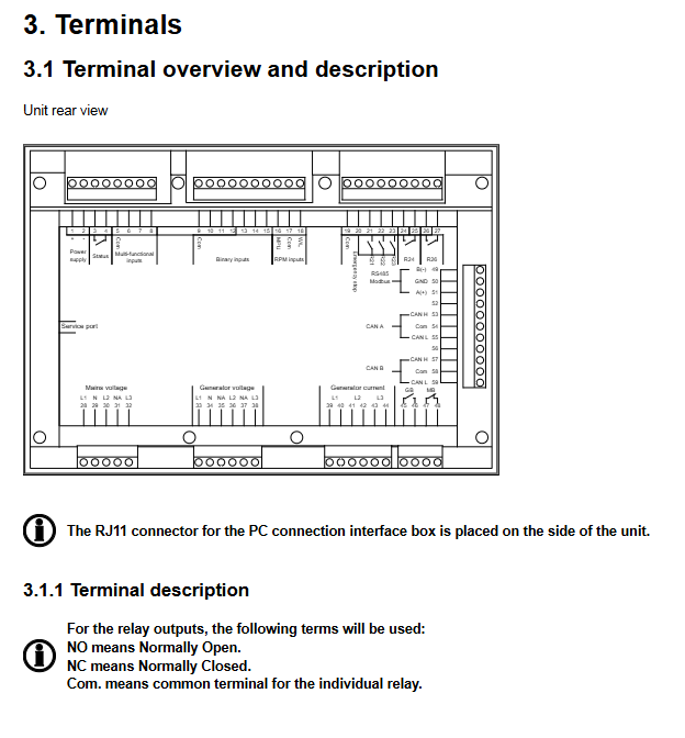 28-32 mains voltage inputs L1-L3, N monitor mains voltage/frequency, 31 terminals are not allowed to be connected without use