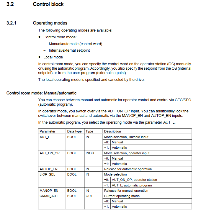 Automatic mode (control room) Automatic program (CFC/SFC) The control word is set by the program and supports external setting values (SP.ET) LIOP_SEL=1, AUTOP_EN=TRUE