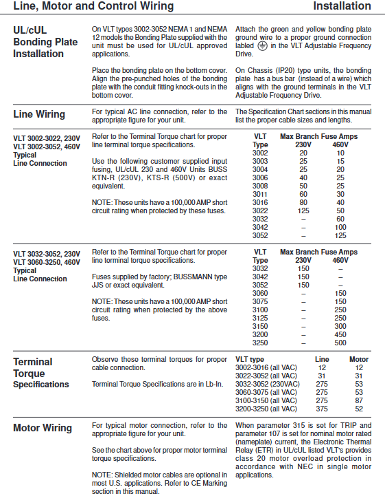 Terminal torque: Control terminal 4.5 Lb In, power terminal 12-31 Lb In (according to wire diameter).