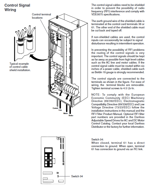 Control line: Shielded cables should be used to avoid parallel laying with power cables (spacing ≥ 6 inches), and one end of the shielding layer should be grounded (terminal 38 or 61).