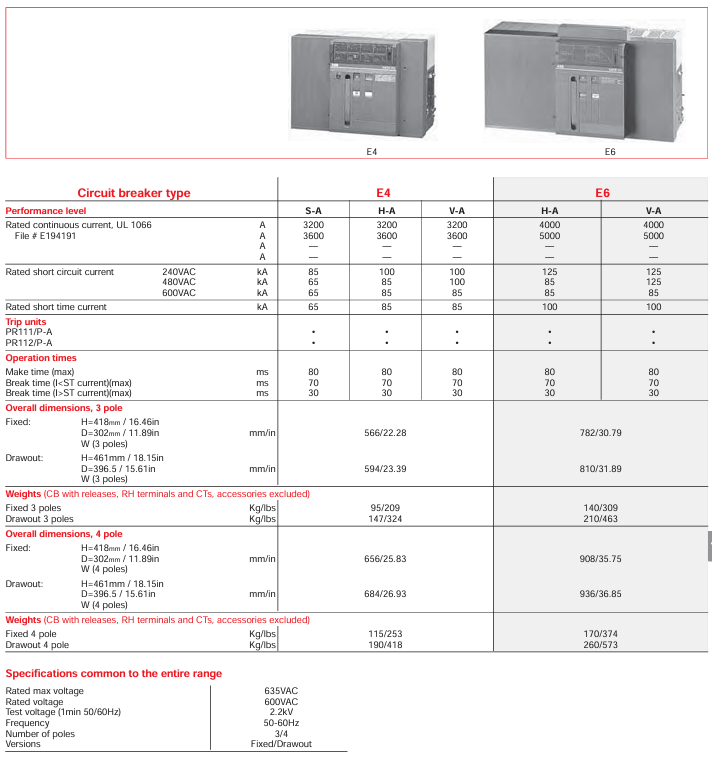 E6 4000-5000 85-125 3/4 fixed/withdrawable 125/275