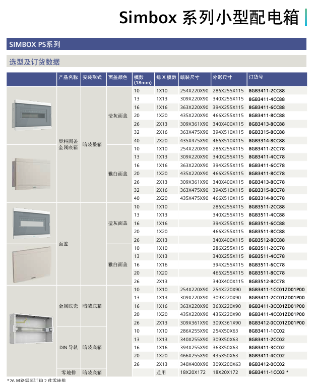 Selection and ordering data (concealed full box, transparent gray cover): | Module (circuit) | Rows × Circuit | Concealed size (mm) | External size (mm) | Order number | | 10 | 1 × 10 | 254 × 220 × 90 | 286 × 255 × 115 | 8GB3411-2CC88 | | 16 | 1 × 16 | 363 × 220 × 90 | 394 × 255 × 115 | 8GB3411-6CC88 | | | 26 | 2 × 13 | 309 × 361 × 90 | 340 × 400 × 115 | 8GB3413-8CC88 | | | 40 | 2 × 20 | 435 × 475 × 90 | 466 × 510 × 115 | 8GB3314-8CC88|