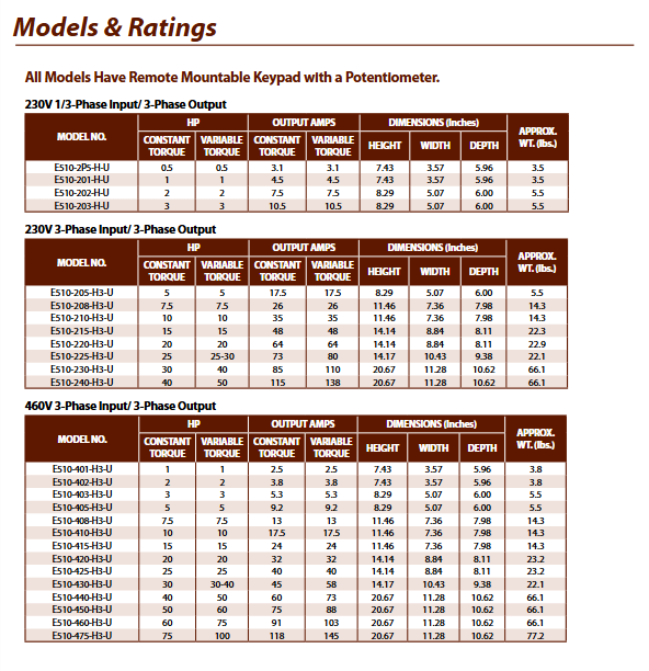 230V 3-phase 5-40HP E510-205-H3-U (5HP), E510-240-H3-U (40HP)