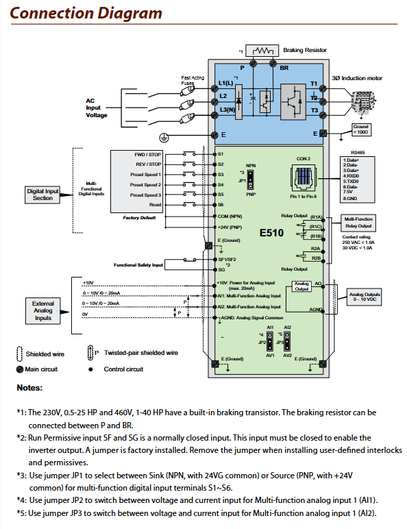 460V 3-phase 1-75HP E510-401-H3-U (1HP), E510-475-H3-U (75HP)