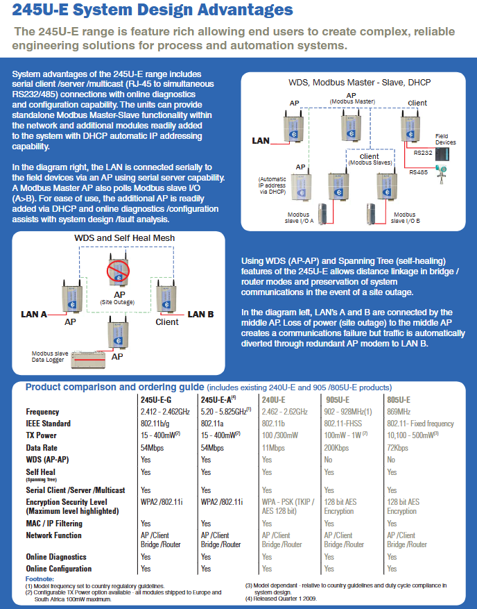 Integrate multiple modes of bridging/routing, Access Point/client to reduce inventory costs of industrial field equipment; Supports point-to-point and point to multipoint broadcast/control modes.