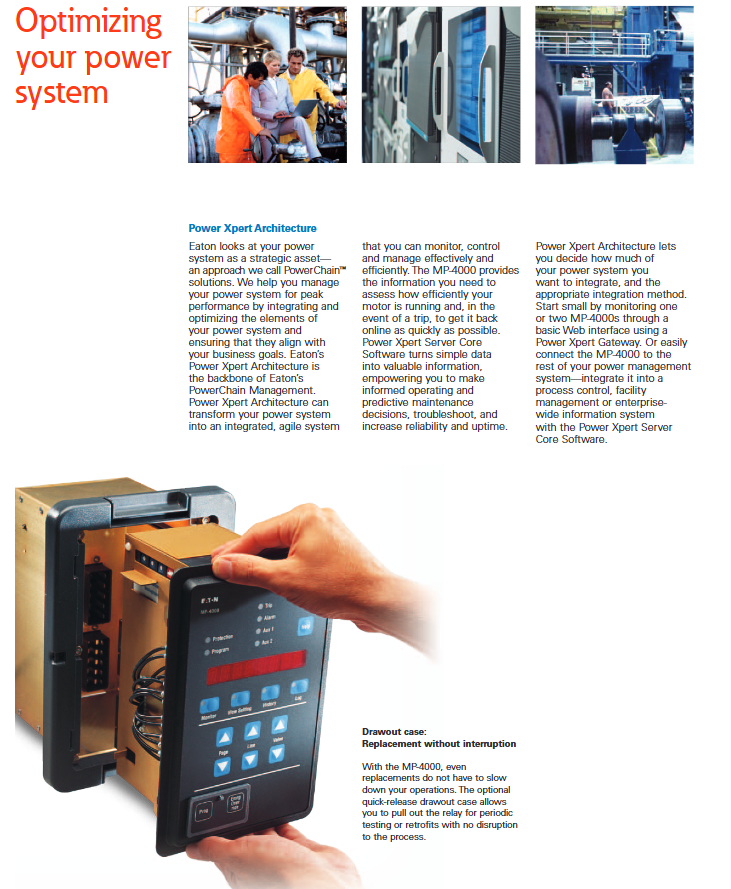 As the core component of Eaton's PowerChain power system solution, the MP-4000 integrates with the Power Xpert architecture to transform the power system into an integrated agile system that can efficiently monitor, control, and manage.