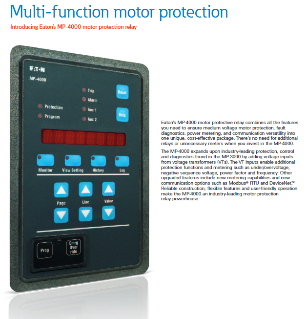Product attributes: Eaton MP-4000 is a multifunctional protection relay specifically designed for medium voltage motors. It integrates protection, fault diagnosis, power metering, and multi-dimensional communication without the need for additional relays/instruments, achieving one-stop motor management and outstanding cost-effectiveness.