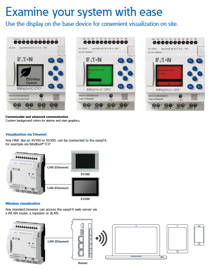 Remote visualization: Connected to HMI via Ethernet (such as XV100/XV300), supporting Modbus TCP protocol; Through WLAN routers, repeaters, or dLANs, standard browsers can access device web servers for wireless monitoring;