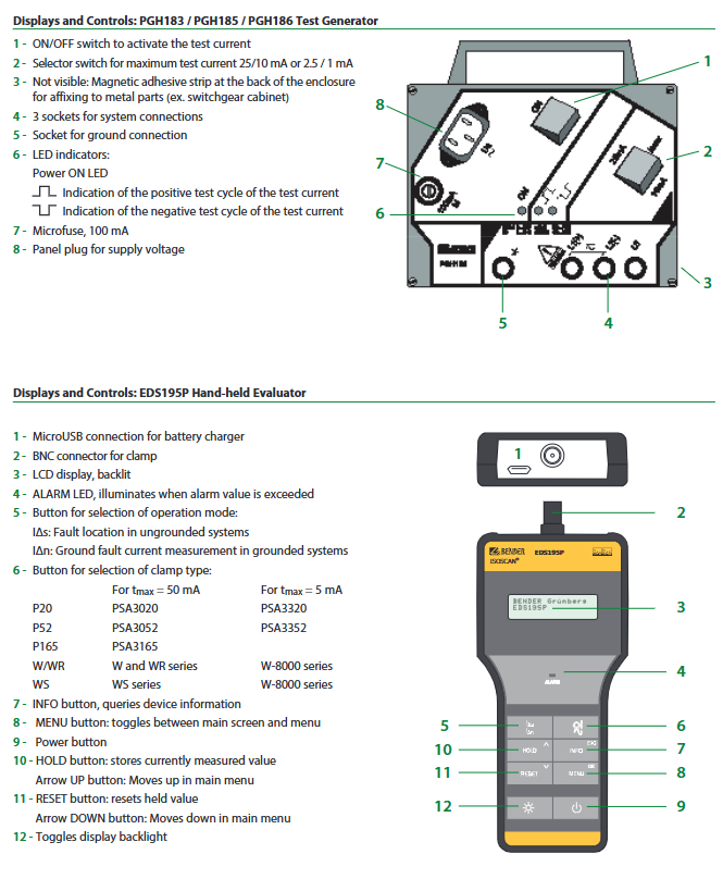 EDS3090 main distribution system is equipped with BENDER fault detectors - EDS195P, PSA3020 (20mm clamp), PSA3052 (52mm clamp) AC 20-575V (42-460Hz), DC 20-504V