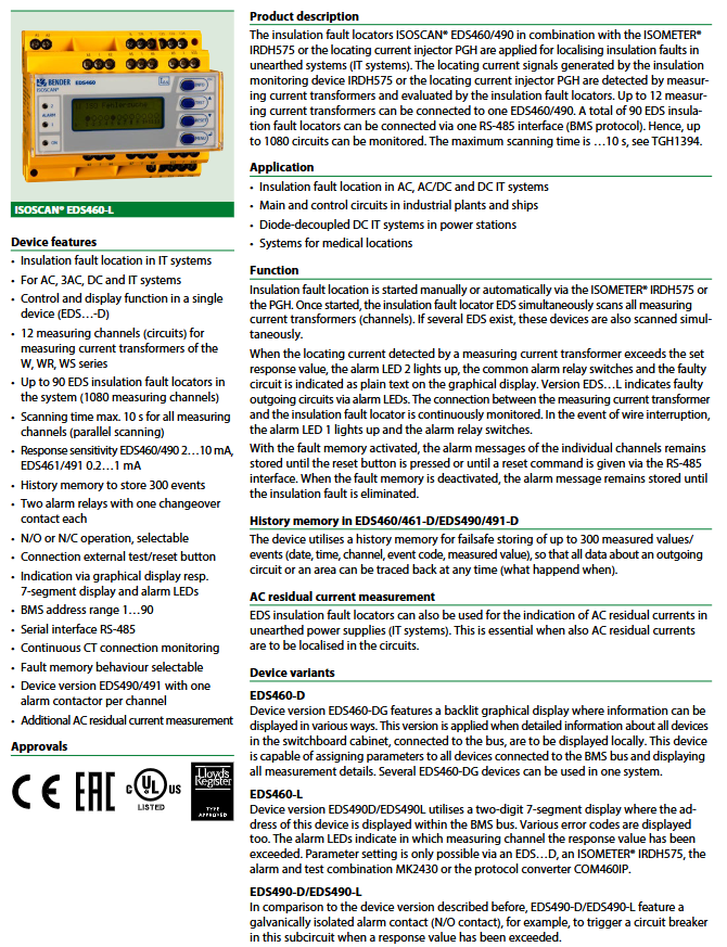 Brand and positioning: ISOSCAN launched by German company BENDER ® The EDS460/490-EDS461/491 series is an industrial grade equipment that integrates "insulation fault location" and "AC residual current measurement (RCM)". Its core positioning is as an electrical safety monitoring tool for IT systems (ungrounded low-voltage distribution systems). It features "multi-channel, networking, and high sensitivity" and is suitable for AC, DC, and AC/DC hybrid IT systems. It is widely used in industrial plants, ships, power station diode isolated DC systems, and medical places.