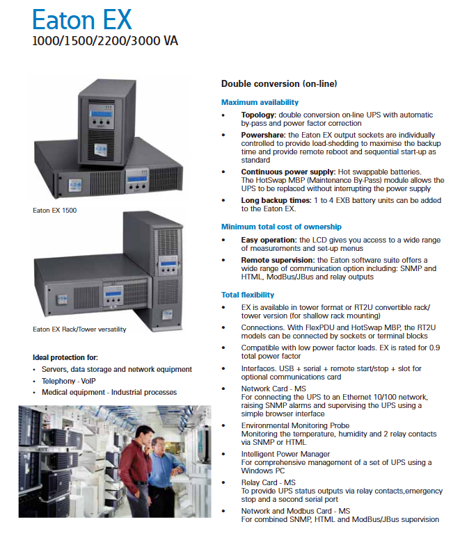 The Eaton EX series UPS is a dual conversion online uninterruptible power supply designed for industrial and commercial scenarios. Its core positioning is to provide stable power protection for servers, data storage, network equipment, VoIP communication, medical equipment, and industrial processes. Through automatic bypass, power factor correction (PFC), and hot swappable design, it ensures power supply continuity and availability, while supporting flexible expansion and remote monitoring to adapt to diverse load requirements (especially low power factor loads, rated PF=0.9). The product offers two forms: tower and RT2U (2U rack/tower convertible) to meet different installation environment requirements.