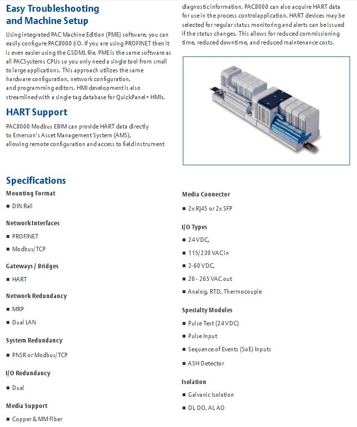 Core positioning: PAC8000 Remote I/O is a fully modular remote I/O solution developed by Emerson for the process industry. It adopts a carrier based architecture and supports applications in general scenarios and hazardous areas (including intrinsic safety signals). It can be seamlessly integrated with PACSystems RX3i and RSTi EP controllers through PROFINET/Modbus TCP, suitable for process control requirements in harsh environments.