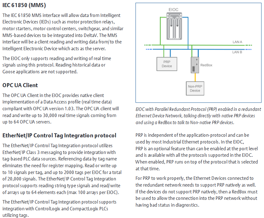 EtherNet/IP PLC、 Intelligent field devices (IFDs), frequency converters, MCCs, etc. support implicit (Class 1) and explicit (Class 3) communication and are compatible with Class 1/3 I/O adapters; Support Class 3 PCCC and UCMM (with Logix tags) message classes; Redundant communication requires special configuration (refer to the DeltaV System Planning Guide) with 256 devices and 32000 signals