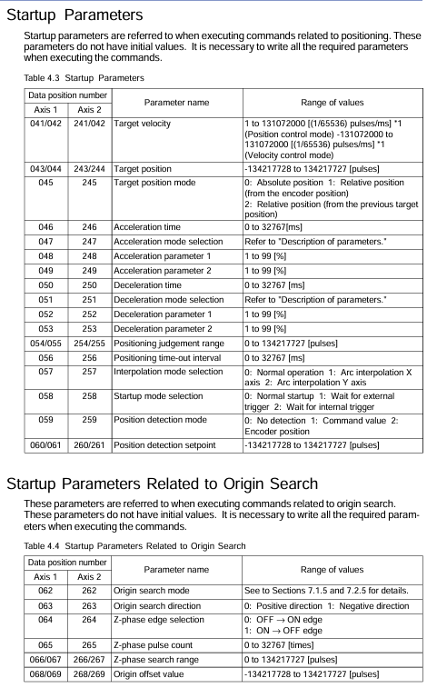 Startup parameters: including target speed, target position, target position mode (absolute/relative), acceleration and deceleration time/mode/parameters, positioning judgment range, timeout time, interpolation mode, startup mode, position detection mode/set value, etc. There is no initial value, which needs to be written before instruction execution.