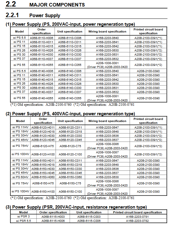 Power regeneration type (PS): 200VAC input (α iPS 5.5~55), 400VAC input (α iPS 11HV~100HV);