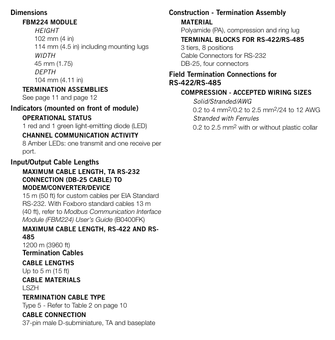 RS-232: Following EIA standards, custom cables can be up to 15m (50 feet) long, while Foxboro standard cables can be up to 13m (40 feet) long;