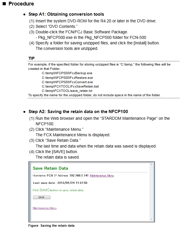 Before restoring the import of NFCP500 FcxRestore<IP/hostname>, the target folder needs to be renamed to "ACKUP" and the SRAM cleared to preserve data