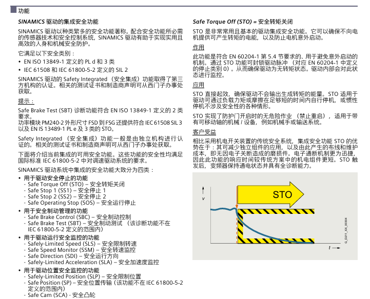 Basic functions (standard) STO (safety torque off), SBC (safety brake control), SS1 (safety stop 1) terminal/ProfiSafe