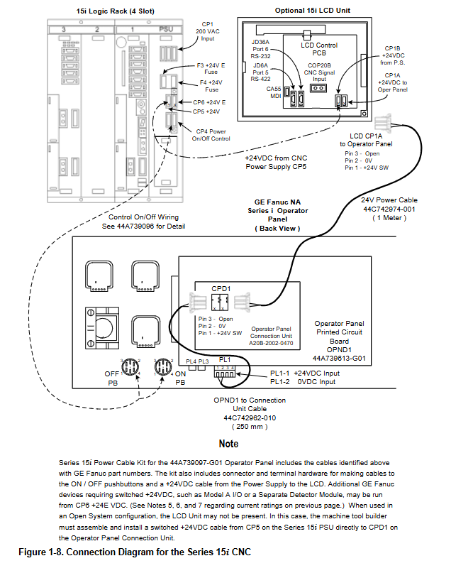 15i CNC: Comes with a 200VAC power supply and can provide 24VDC on its own. It requires a dedicated cable kit 44A739097-G01. The ON/OFF button on the panel is directly connected to the 15i power module without the need for a built-in switch circuit on the panel.
