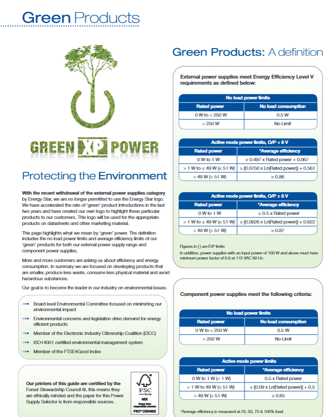 External/desktop power supply (VEP, AFM series): 8-250W, Energy Efficiency Level V, CEC2008/EASA2007 compliant, replaceable input plug