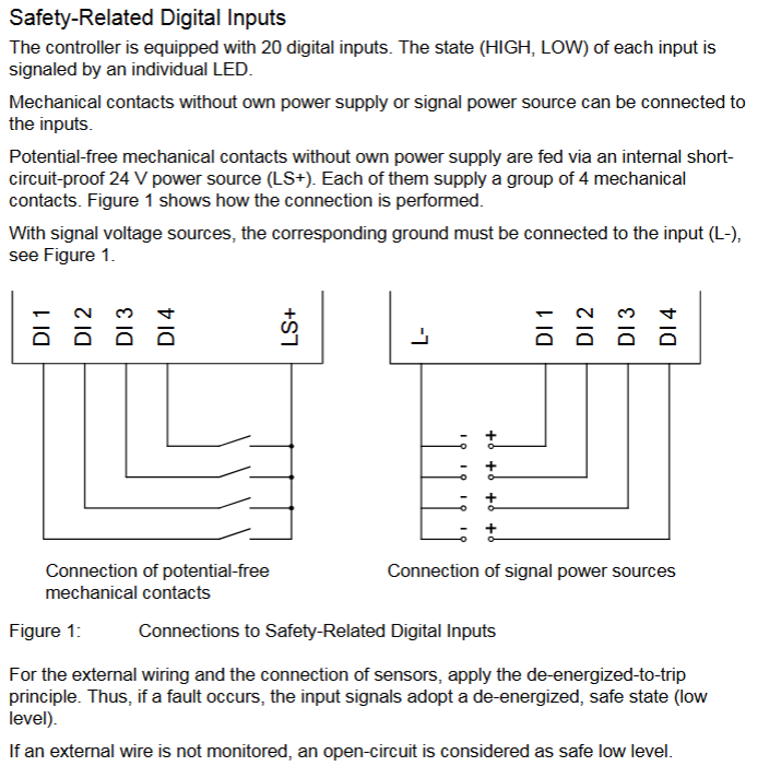 Digital input: 20 non isolated inputs, divided into 5 groups for power supply (4 in each group, LS+is a short-circuit protection 24V power supply), supports "power loss trip" logic (input is in a low-level safety state in case of fault), and can be configured with line control to detect short circuits/open circuits;