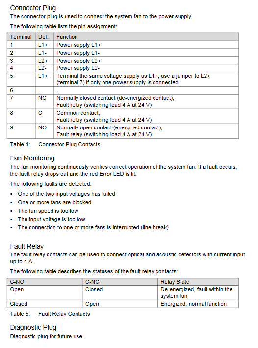 Fan monitoring: Real time detection of voltage abnormalities, fan stalling, low speed, line interruptions, and other faults. When a fault occurs, the red Error LED lights up and the fault relay is released;