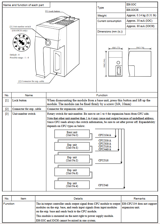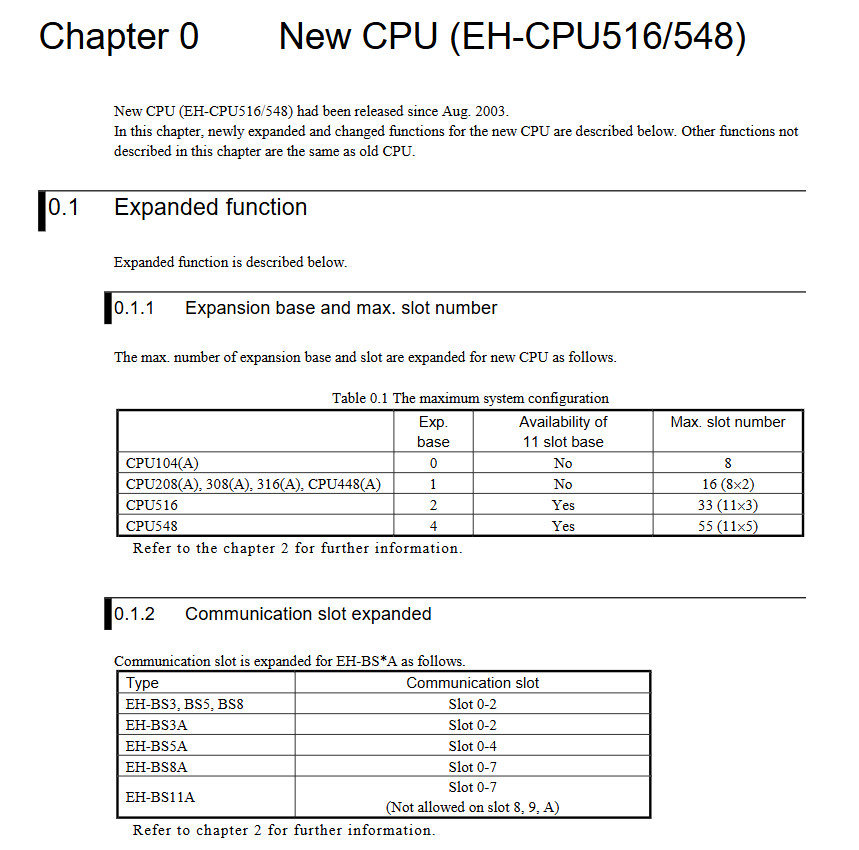 |EH-CPU448 (A) | 1024 | 48.5k steps | 0.1 µ s/instruction | 1 | Floating point operation, memory board support|