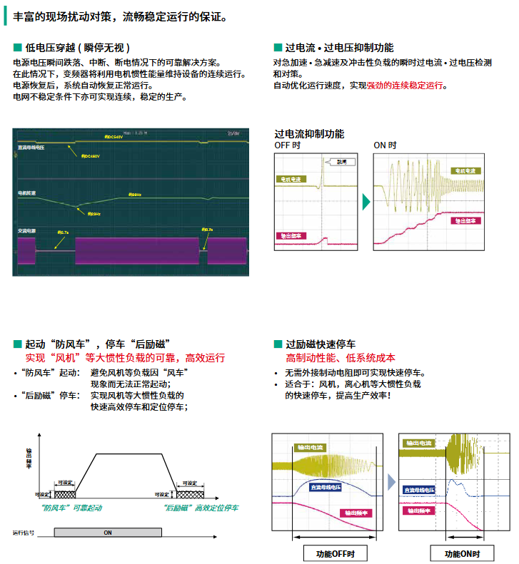 Smooth and stable (driving) low voltage ride through (ignoring momentary stops), over-current/over-voltage suppression, windmill start prevention, rear excitation shutdown, continuous operation under power grid/load disturbances, reliable start stop of large inertia loads