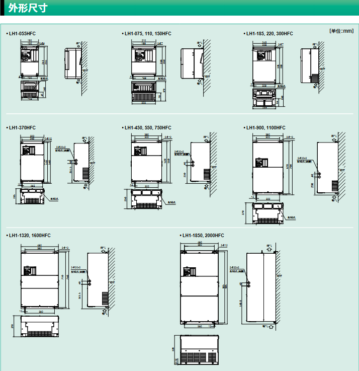 Rated specifications: 400V voltage level, suitable for motor power of 5.5kW~355kW, corresponding models are as follows LH1-055HFC(5.5kW)、LH1-3550HFC(355kW)